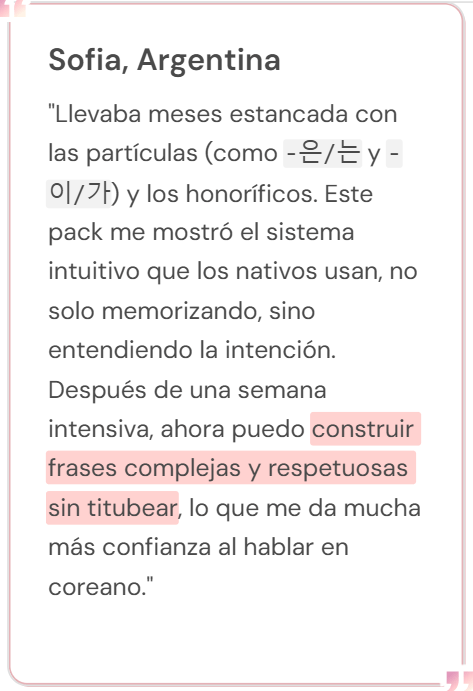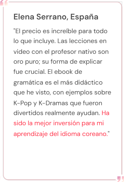 🔓 Desbloquea la Gramática "Secreta": No más conjugaciones complejas ni honoríficos misteriosos. El Ebook de Gramática (+80 páginas) te da la lógica real detrás de cómo los coreanos realmente construyen sus frases, permitiéndote hablar con fluidez.